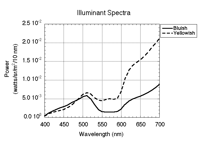 The graph below shows the spectra of the bluish and yellowish illuminants used for the Blue, Blue_Y, and Yellow images.